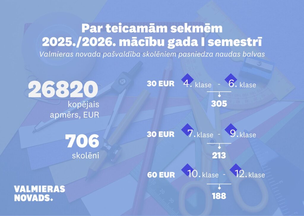 706 skolēni saņēmuši Valmieras novada pašvaldības naudas balvu par teicamām sekmēm