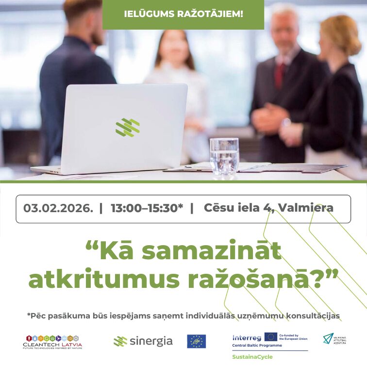 Semināru organizē “Cleantech Latvia” sadarbībā ar Valmieras Attīstības aģentūru, kas īsteno Interreg Centrālas Baltijas projektu “SustainaCycle”. Šī projekta mērķis ir stiprināt aprites ekonomiku Vidzemē un veicināt uzņēmumu pāreju uz ilgtspējīgu ražošanu.