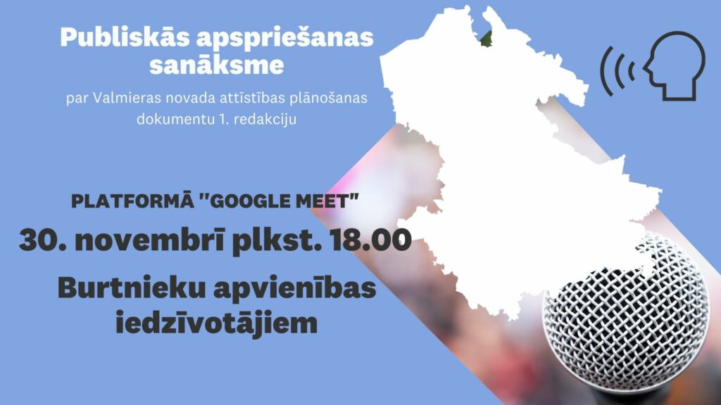 Lai veicinātu līdzsvarotu Valmieras novada teritorijas attīstību, un turpinātu darbu pie kopējās ilgtspējīgas attīstības stratēģijas un attīstības programmas izstrādes, šodien, 30. novembrī, plkst. 18.00 platformā “Google Meet” norisināsies publiskās apspriešanas sanāksme Burtnieku apvienības iedzīvotājiem par Valmieras novada attīstības plānošanas dokumentu 1. redakciju.