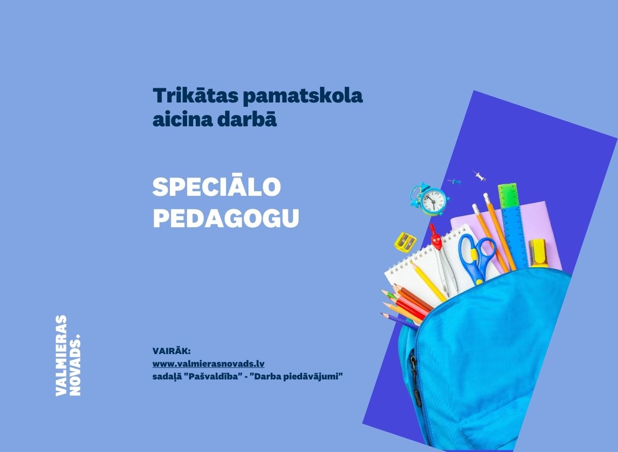 Trikātas pamatskola (turpmāk – Iestāde) aicina darbā speciālo pedagogu (0,59 likmes jeb 17,7 stundas nedēļā) uz nenoteiktu laiku. Darba vietas adrese: “Gaismaskalns”, Trikāta, Trikātas pagasts, Valmieras novads.