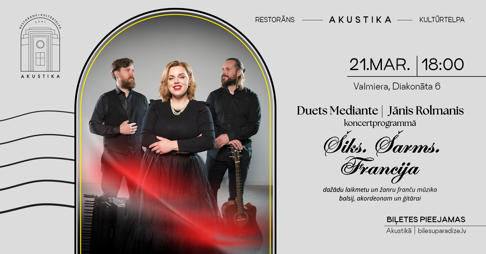21. martā plkst. 18.00 kultūrtelpā “Akustika” izskanēs franču mūzikas programma “Šiks. Šarms. Francija”, kurā piedalīsies duets “Mediante” un ģitārists Jānis Rolmanis.