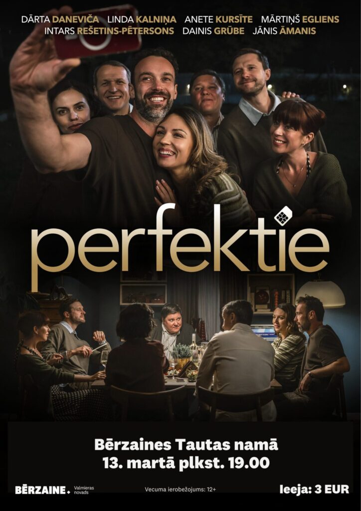 13. martā plkst. 19.00 Bērzaines Tautas namā režisora Dž. Dž. Džilindžera melnā humora komēdija “Perfektie”. Vecuma ierobežojums: 12+. Ieeja: 3 EUR.
