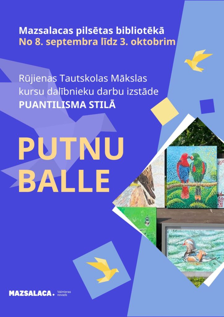 No 8. septembra līdz 3. oktobrim Mazsalacas pilsētas bibliotēkā Rūjienas Tautskolas mākslas kursa pieaugušajiem radošo darbu izstāde puantilisma stilā “Putnu balle”.