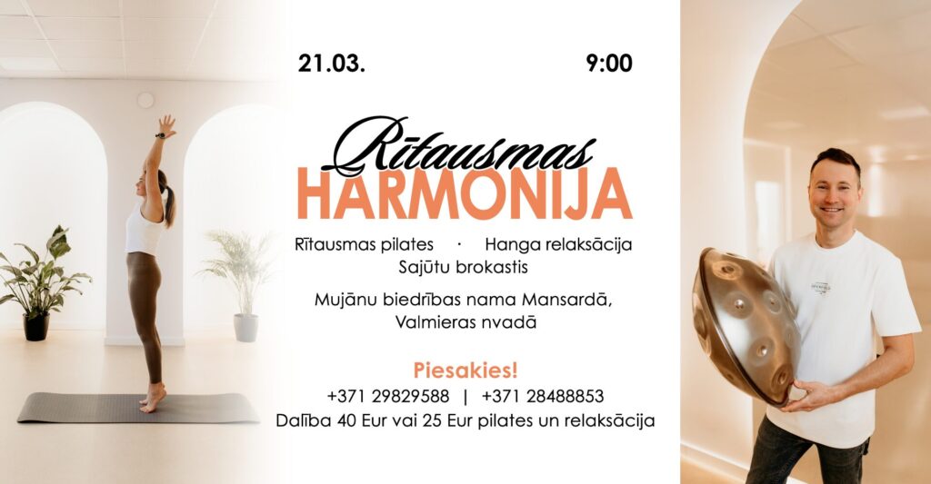 Vari pieteikt savu dalību un pilatēm un hanga relaksāciju – 25 EUR vai baudīt Rītausmas harmoniju pilnībā – 40 EUR.