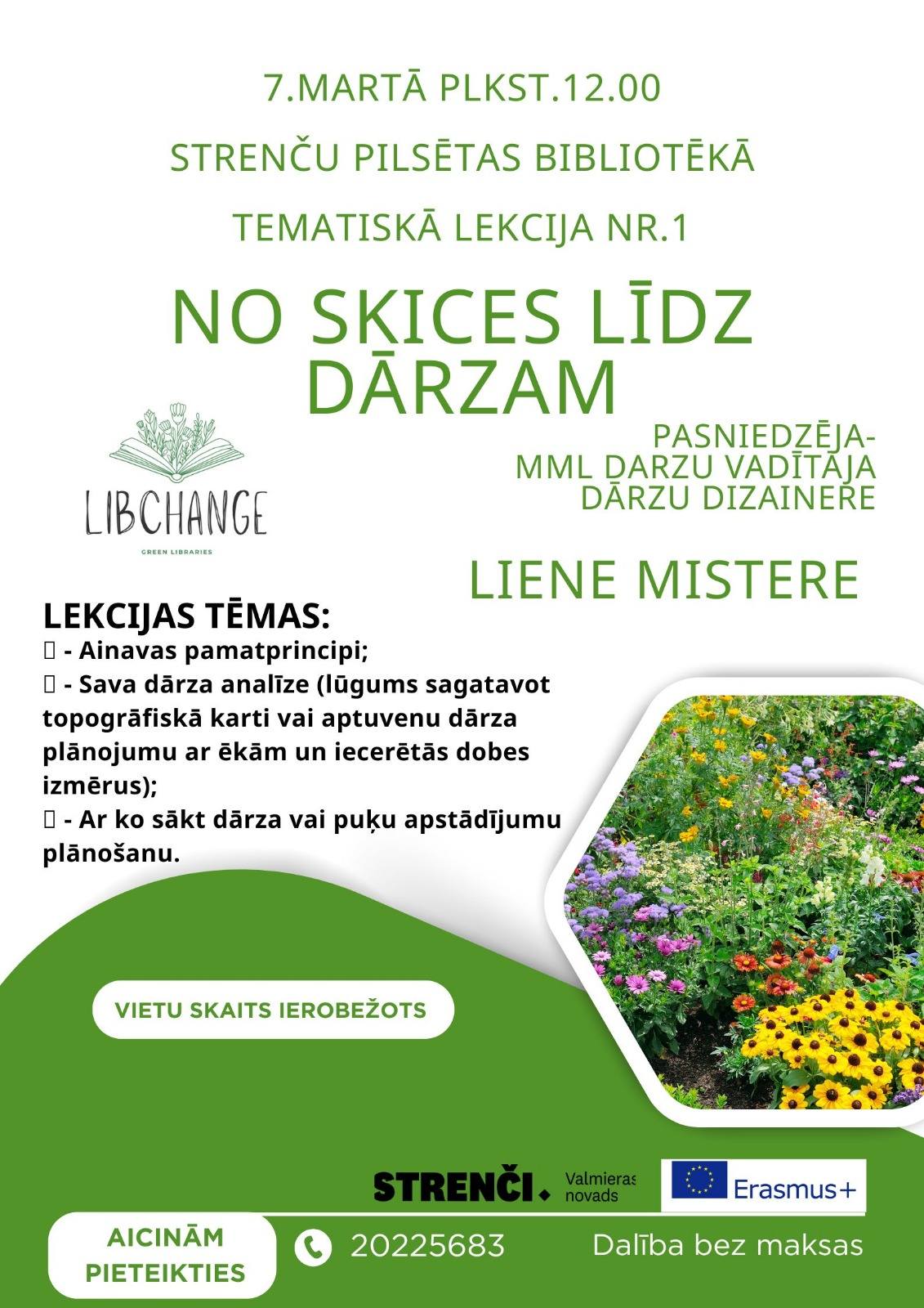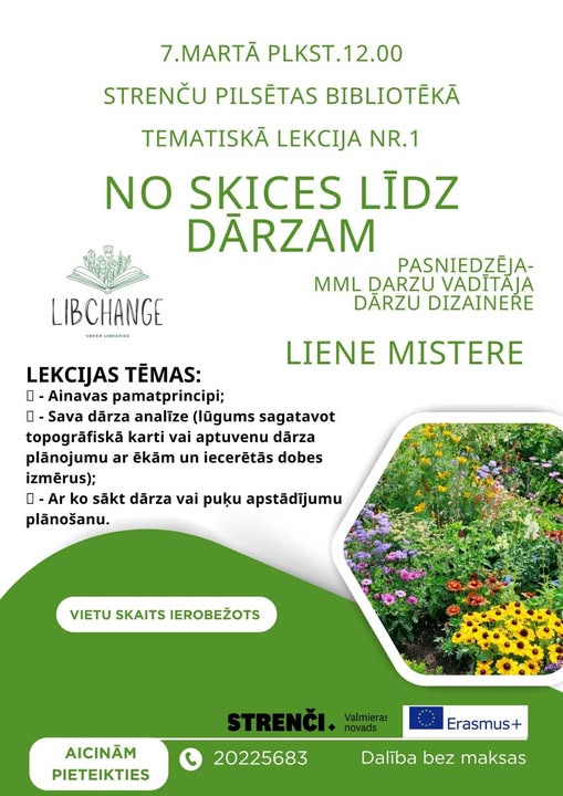 7. martā plkst. 12.00 Strenču pilsētas bibliotēkā pirmā sešu lekciju cikla tematiskā lekcija “No skices līdz dārzam”.