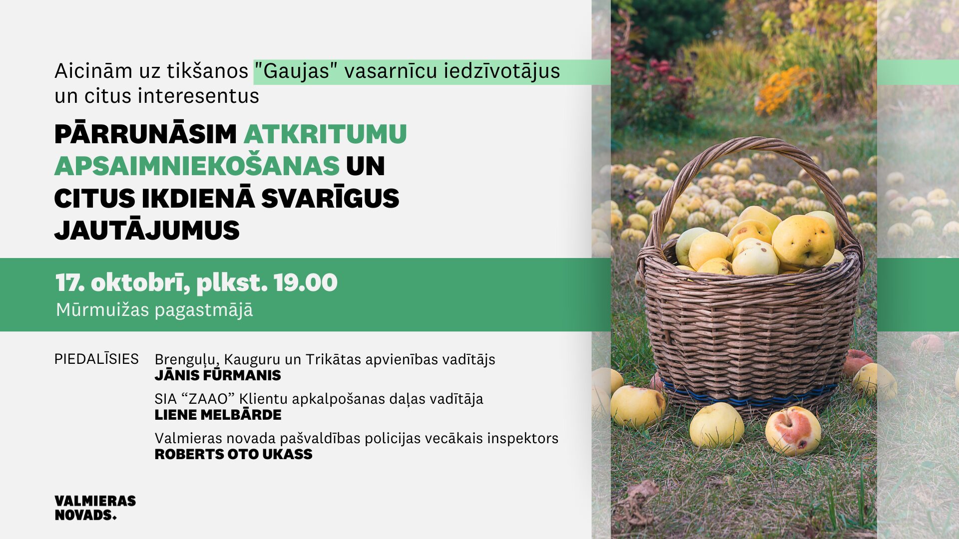 “Gaujas” vasarnīcu iedzīvotāji un citi interesenti – aicinām uz sapulci, kurā pārrunāsim atkritumu apsaimniekošanas jautājumus, kā arī citus ikdienā svarīgus tematus.