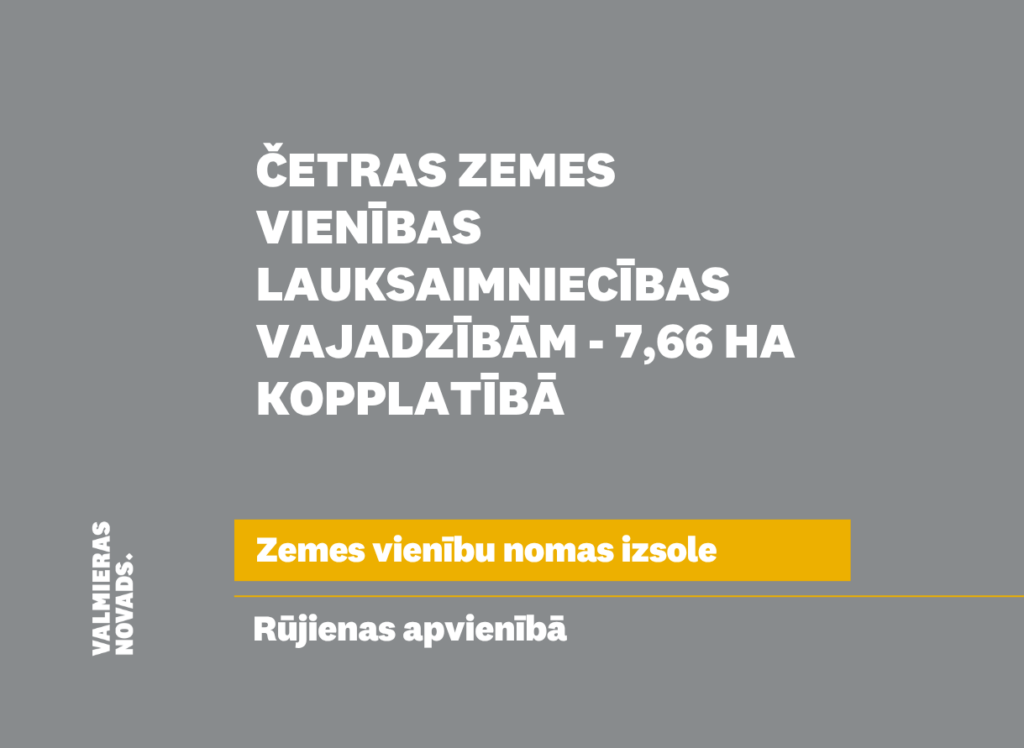 Valmieras novada pašvaldība izsludina pirmo mutisko nomas tiesību izsoli uz izsoles objektu – četrām zemes vienībām ar kadastra apzīmējumiem 9656 003 0185, 9656 003 0168, 9656 003 0165, 9656 003 0167, 7,66 ha kopplatībā.