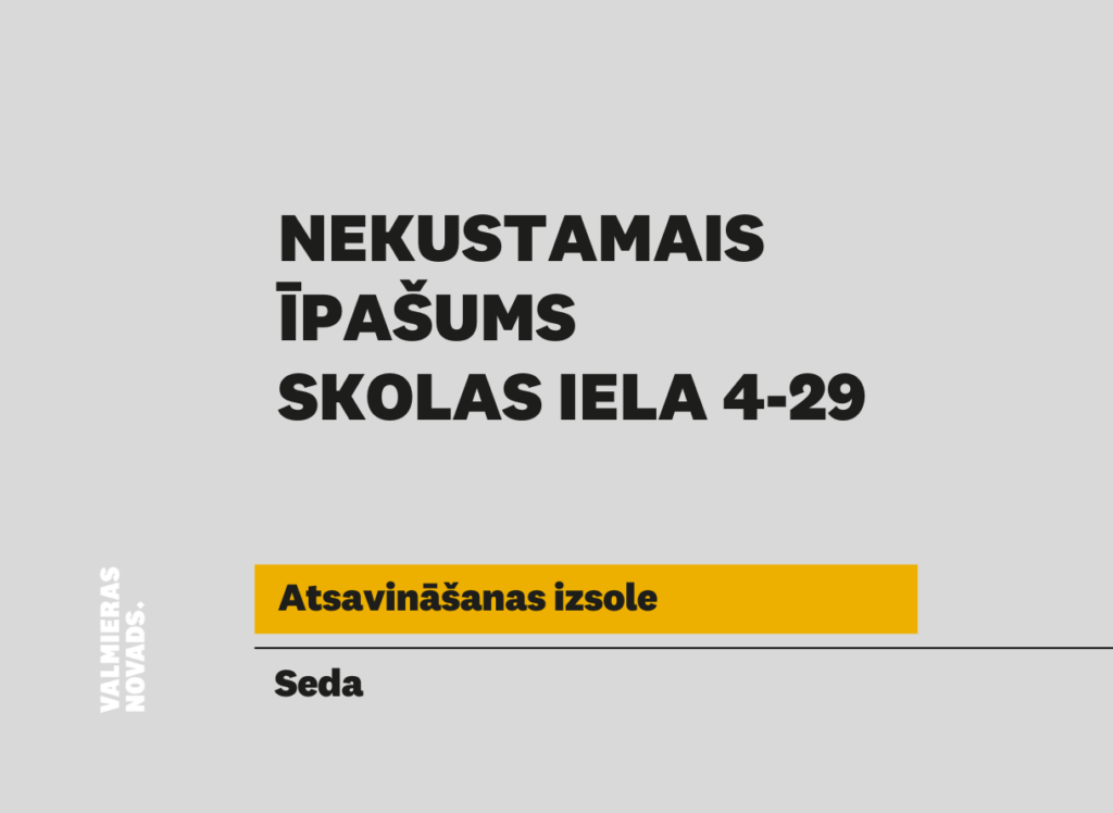 Valmieras novada pašvaldība rīko elektronisko izsoli ar augšupejošu soli dzīvokļa īpašumam Sporta iela 4 – 29, Sedā, Valmieras novadā, kadastra numurs 9413 900 0493, kas sastāv no dzīvokļa ar kopējo platību 54,40 m2 (telpu grupas kadastra apzīmējums 9413 001 0730 001 029), 526/21843 kopīpašuma domājamām daļām no dzīvojamās mājas (kadastra apzīmējums 9413 001 0730 001).