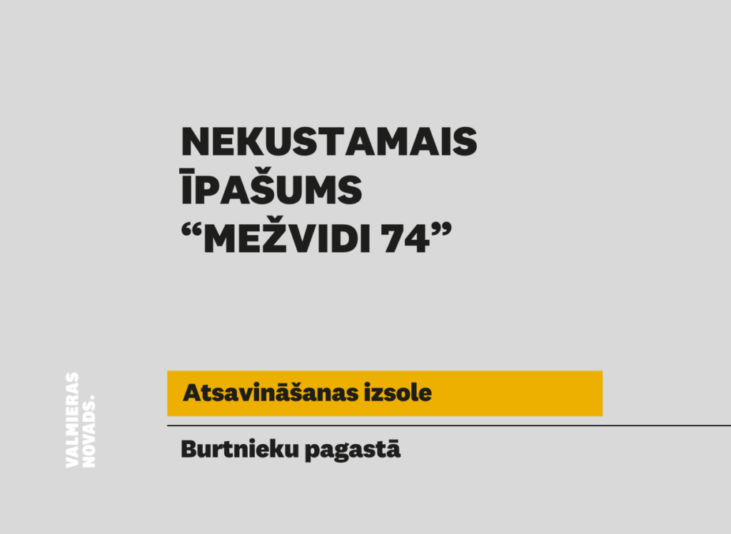 Valmieras novada pašvaldība rīko elektronisko izsoli ar augšupejošu soli nekustamajam īpašumam “Mežvidi 74”, Burtnieku pagastā, Valmieras novadā, kadastra numurs 9648 016 0142, kas sastāv no zemes vienības ar kadastra apzīmējumu 9648 016 0364 633 m2 platībā.
