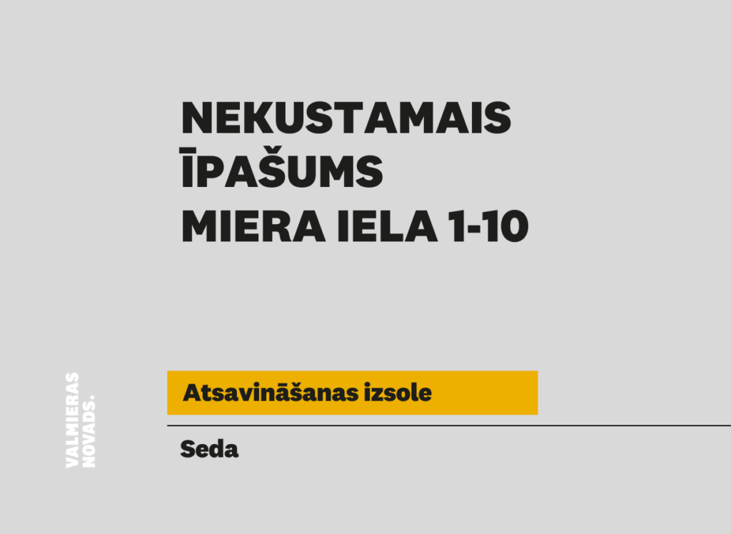 Valmieras novada pašvaldība rīko elektronisko izsoli ar augšupejošu soli nekustamam īpašumam Miera iela 1-10, Sedā, Valmieras novadā, kadastra numurs 9413 900 0302, kas sastāv no dzīvokļa ar kopējo platību 98,40 m2 (telpu grupas kadastra apzīmējums 9413 001 0219 001 010), 984/13884 kopīpašuma domājamām daļām no dzīvojamās mājas (kadastra apzīmējums 9413 001 0219 001), 984/13884 kopīpašuma domājamām daļām no zemes ar kadastra apzīmējums 9413 001 0219.