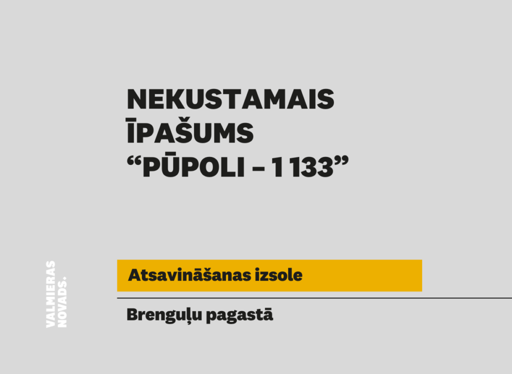 Valmieras novada pašvaldība rīko elektronisko izsoli ar augšupejošu soli nekustamajam īpašumam “Pūpoli – 1 133”, Brenguļu pagastā, Valmieras novadā, kadastra Nr.9646 001 0213, kas sastāv no zemes vienības ar platību 0,0602 ha un kadastra apzīmējumu 9646 001 0213.