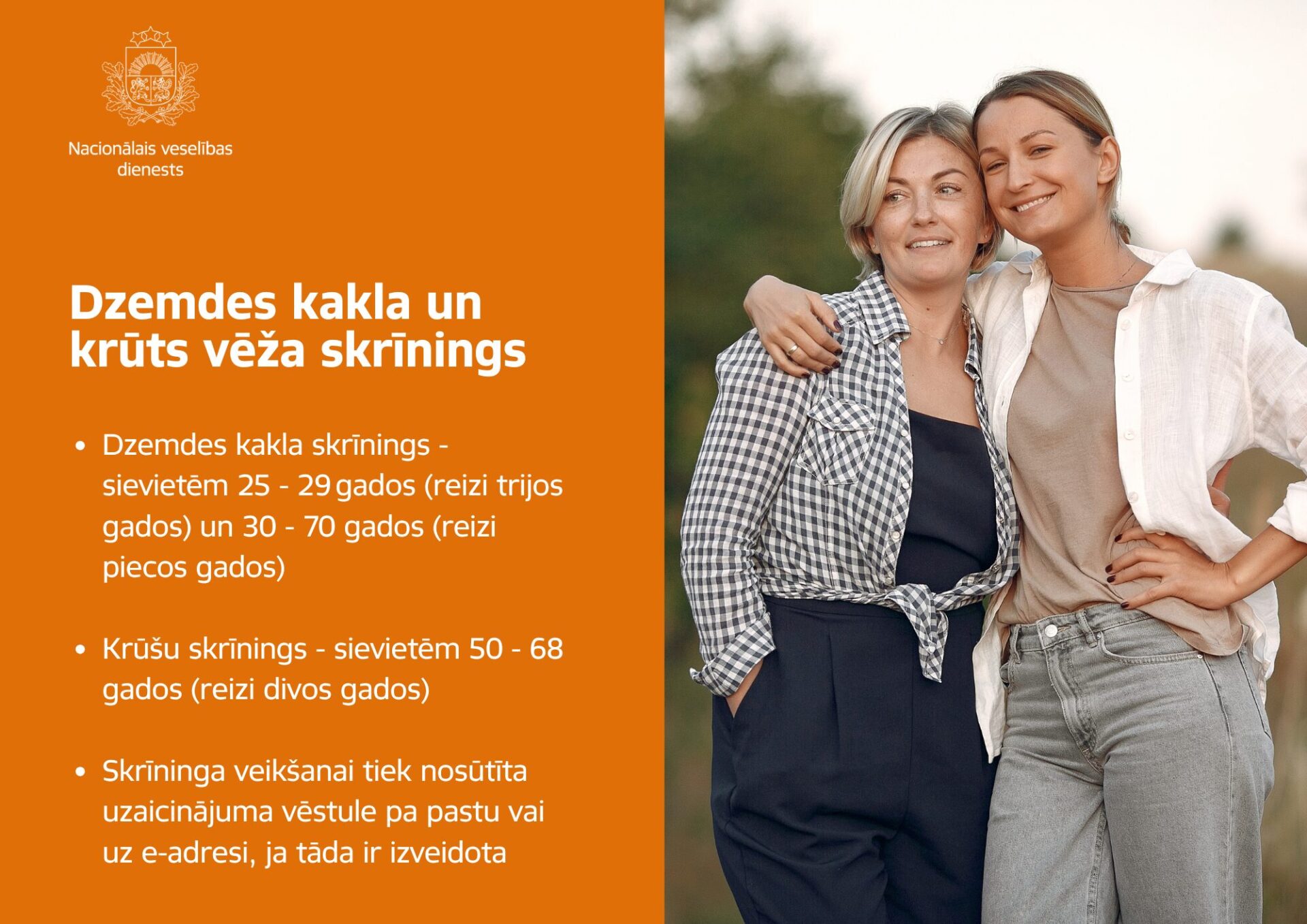 Šīs uzaicinājuma vēstules tiek nosūtītas aptuveni trīs mēnešus pēc dzimšanas dienas datuma, pa pastu uz deklarēto dzīvesvietas adresi vai e-adresi portālā Latvija.gov.lv, ja tāda ir izveidota. Vairāk informācijas var uzzināt, ieskatoties NVD tīmekļvietnes www.vmnvd.gov.lv sadaļā “Vēža profilaktiskās pārbaudes”.
