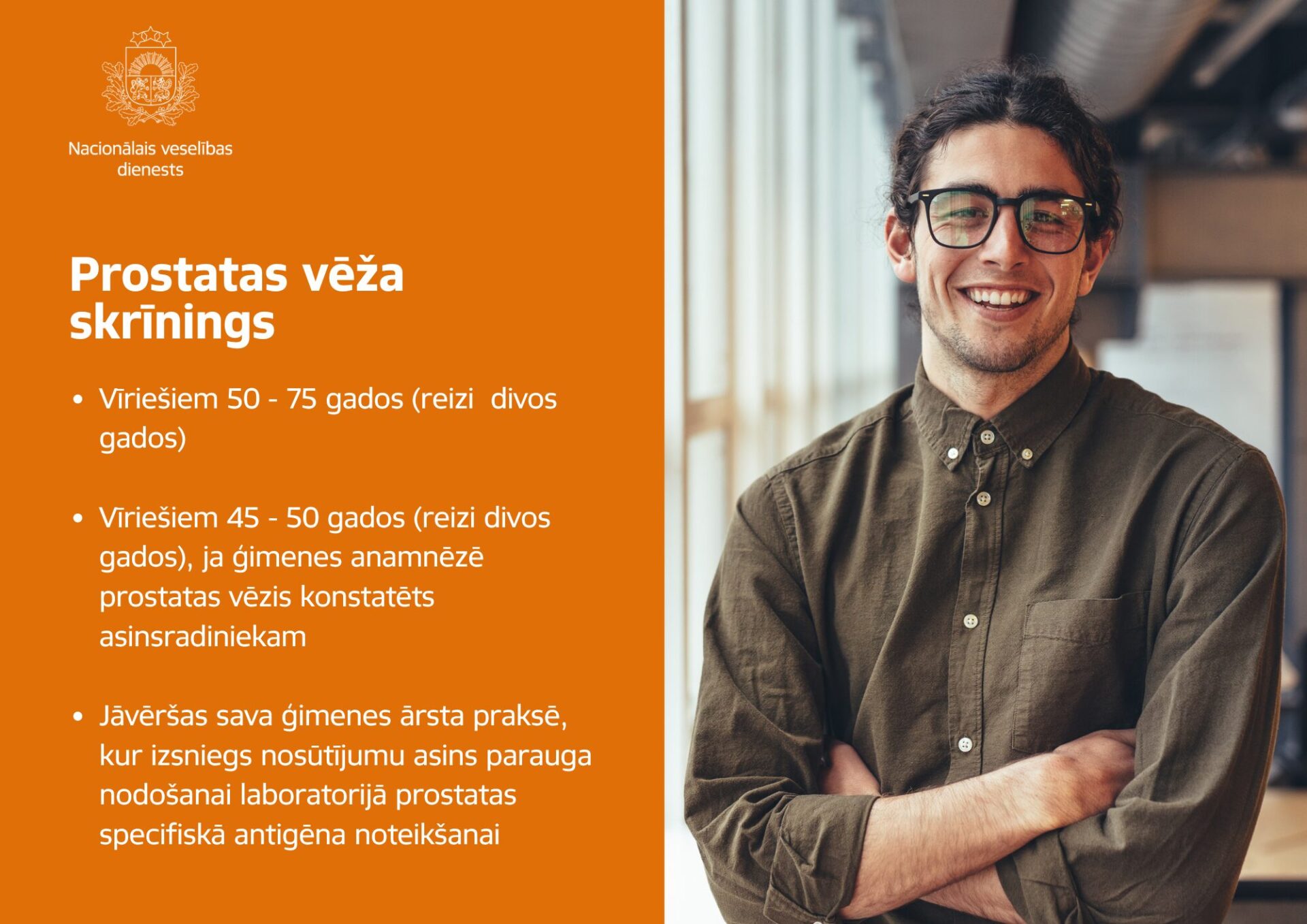 Otra profilaktiskā pārbaude, kuru organizē ģimenes ārstu praksēs, ir prostatas jeb priekšdziedzera vēža profilaktiskā pārbaude. Tā paredz specifisku asins analīžu veikšanu reizi divos gados visiem vīriešiem vecumā no 50 līdz 75 gadiem. Pārbaude ieteicama arī vīriešiem no 45 līdz 50 gadu vecumam (reizi divos gados), ja ģimenes anamnēzē prostatas vēzis ir konstatēts asinsradiniekam. Lai veiktu pārbaudi, jāsazinās ar sava ģimenes ārsta praksi un jāveic pieraksts. Vizītes laikā tiks izsniegts nosūtījums asins parauga nodošanai, lai laboratorijā noteiktu prostatas specifisko antigēnu (PSA), skaidro NVD.