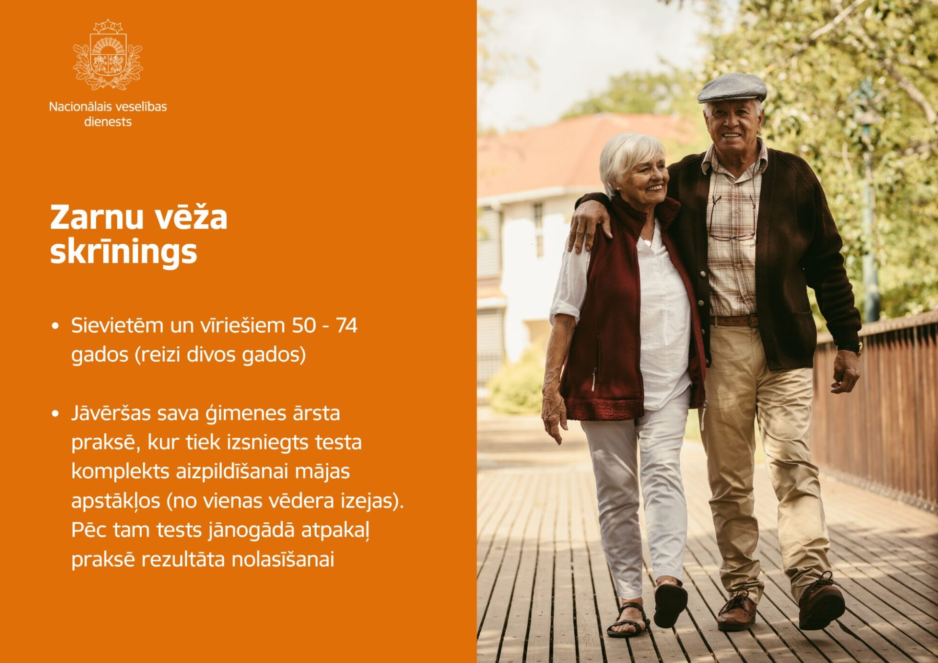 Valsts apmaksātu zarnu vēža profilaktisko pārbaudi reizi divos gados ieteicams veikt sievietēm un vīriešiem vecumā no 50 līdz 74 gadiem. Lai veiktu profilaktisko pārbaudi, pacientam sākotnēji jāvēršas savā ģimenes ārsta praksē, kurā tiek izsniegts testa komplekts slēpto asiņu noteikšanai fēcēs, kas ir jāaizpilda mājas apstākļos (no vienas vēdera izejas). Pēc tam tests jānogādā praksē rezultāta nolasīšanai. Būtiski, ka pirms testa veikšanas vairs nav jāievēro noteikti ēšanas ierobežojumi, jo tiek izmantots jaunā tipa tests, informē NVD.
