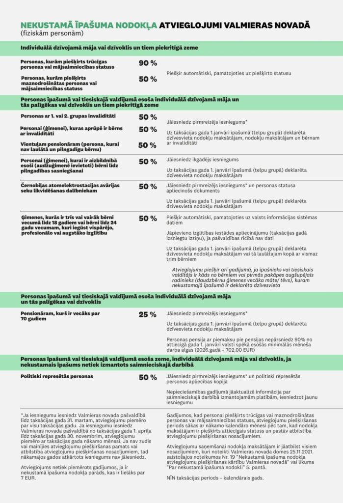 Valmieras novadā atsevišķām nodokļa maksātāju kategorijām var tikt piešķirti nekustamā īpašuma nodokļa atvieglojumi, pamatojoties uz: