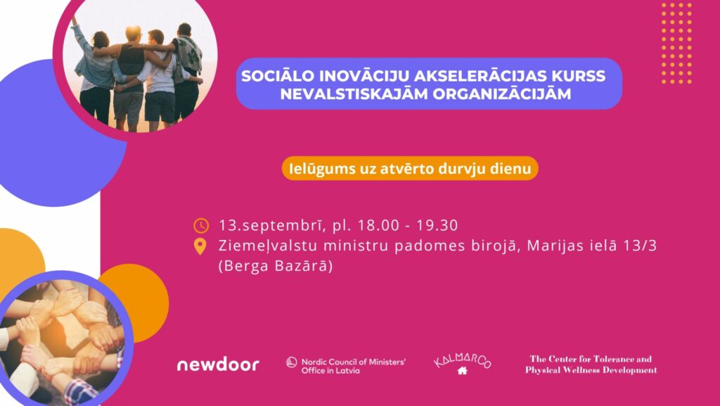 No 5. septembra Latvijā bāzētās nevalstiskās organizācijas (NVO) tiek aicinātas pieteikties “NewDoor sociālo inovāciju akselerācijas kursam nevalstiskajām organizācijām”, kas ir pirmā šāda veida programma Latvijā priekš NVO. Savukārt 13.septembrī projekta organizatori un sadarbības partneri aicina uz atklāšanas pasākumu klātienē Ziemeļvalstu Ministru padomes biroja Latvijā mītnē. Pasākums notiks no pl. 18.00 – 19.30 Marijas ielā 13/3 (Berga Bazārs), Rīgā.