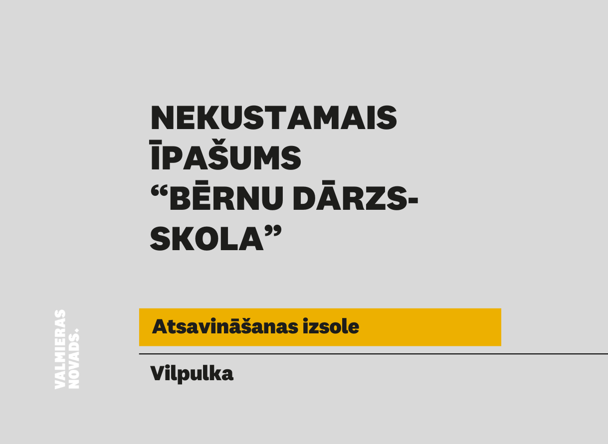 Valmieras novada pašvaldība rīko elektronisko izsoli ar augšupejošu soli nekustamam īpašumam “Bērnu dārzs-Skola”, Vilpulkā, Vilpulkas pagastā, Valmieras novadā, kadastra numurs 9694 002 0248, kas sastāv no zemes vienības 0,98 ha…