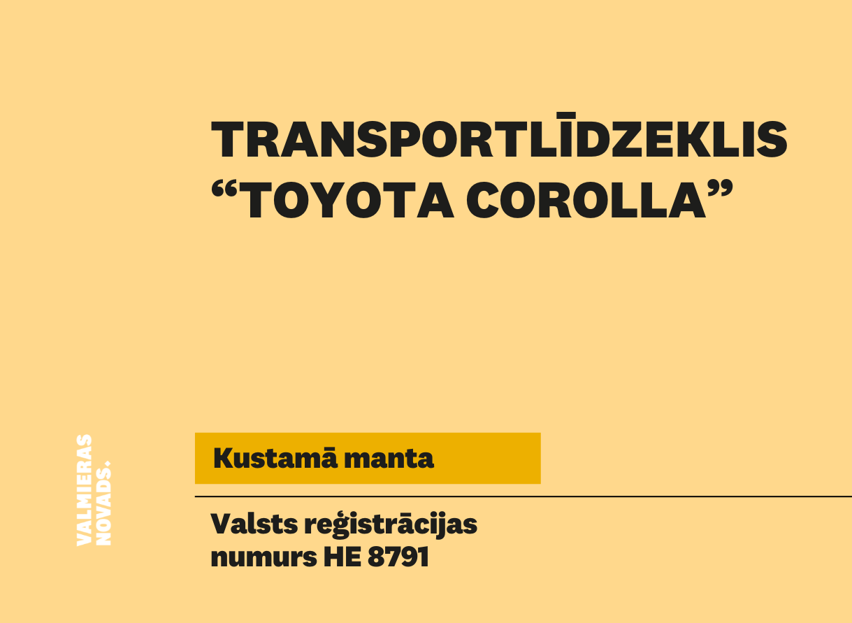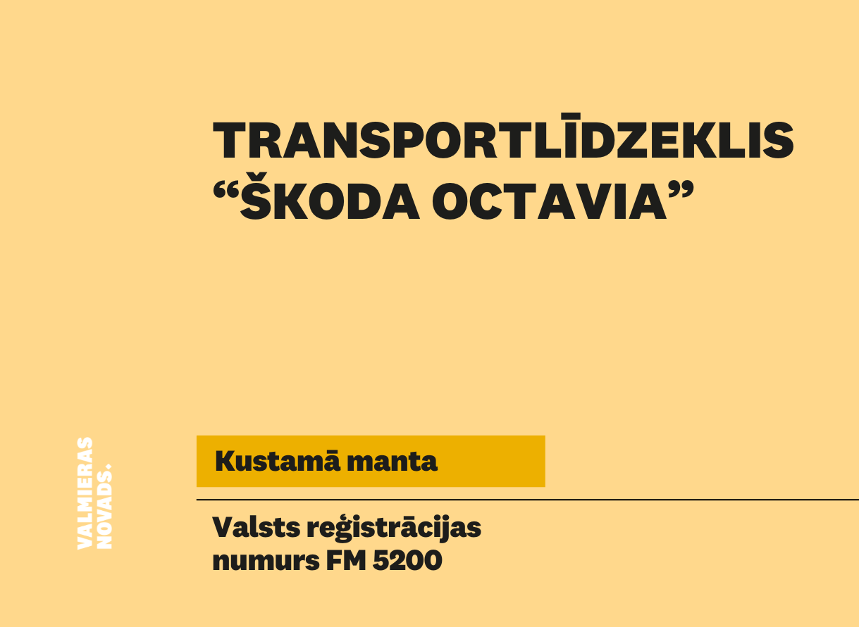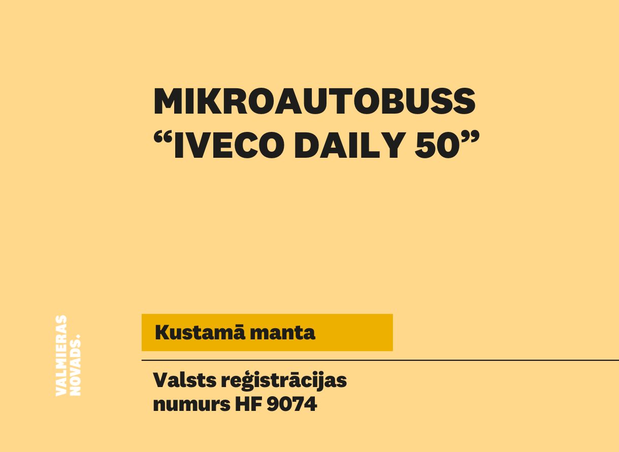 Valmieras novada pašvaldība rīko elektronisko izsoli ar augšupejošu soli mikroautobusa “IVECO DAILY 50” (valsts reģistrācijas numurs HF 9074). Sākumcena – 1454,55 euro, solis – 50.00 euro, izsoles nodrošinājuma nauda – 145,46…