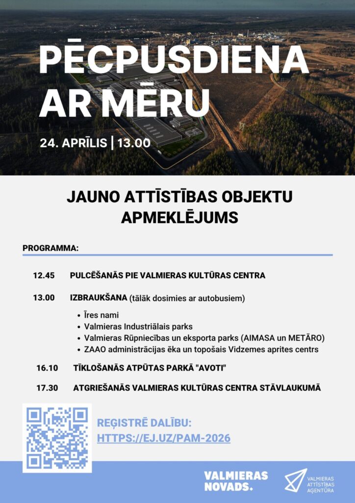 2026. gada 24. aprīlī uzņēmēji un citi interesenti aicināti piedalīties izbraukumā “Pēcpusdiena ar mēru”, kura laikā vienas pēcpusdienas garumā būs iespēja klātienē iepazīt nozīmīgākos Valmieras attīstības objektus un uzņēmējdarbības vidi.