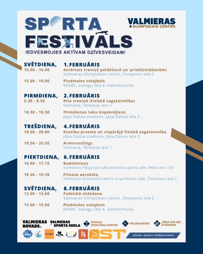 Vietu skaits festivāla aktivitātēs ir ierobežots – obligāta iepriekšēja pieteikšanās. Aktivitāšu kalendārs pieejams šeit: https://www.valmierasoc.lv/pasakumi/kategorija/valmieras-olimpiska-centra-sporta-festivals/?tribe_event_display=month&tribe-bar-date=2026-02-01