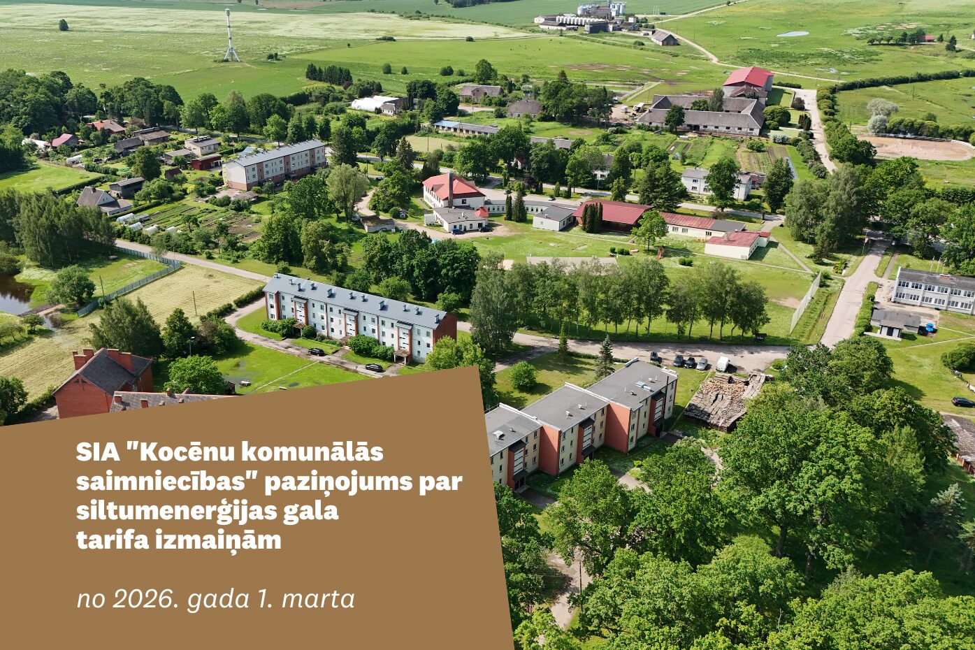 Sabiedrība ar ierobežotu atbildību “KOCĒNU KOMUNĀLĀ SAIMNIECĪBA”, vienotais reģistrācijas numurs LV44103096618, juridiskā adrese: Alejas iela 8, Kocēni, Kocēnu pagasts, Valmieras novads, LV-4220, Sabiedrisko pakalpojumu regulēšanas komisijai iesniedz siltumenerģijas apgādes pakalpojuma sabiedrisko pakalpojumu sniedzēja noteikto tarifu, kas ir aprēķināts saskaņā ar 2010. gada 14. aprīļa Sabiedrisko pakalpojumu regulēšanas komisija padomes lēmumu Nr.1/7 “Siltumenerģijas apgādes pakalpojumu tarifu aprēķināšanas metodika”, un pamatojumu noteiktajam tarifam.