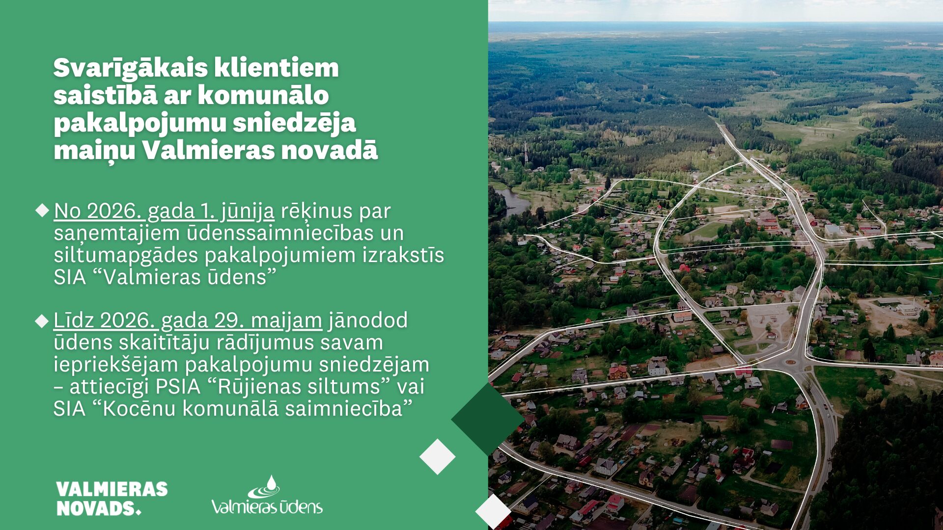 Svarīgi! Klienti aicināti līdz 2026. gada 29. maijam nodot ūdens skaitītāju rādījumus savam iepriekšējam pakalpojumu sniedzējam – attiecīgi PSIA “Rūjienas siltums” vai SIA “Kocēnu komunālā saimniecība”.