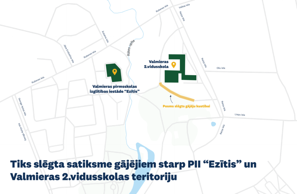 Valmieras 2. vidusskolas struktūrvienības bērnudārza “Varavīksne” pārbūves ietvaros notiks labiekārtošanas darbi, kuru dēļ no 15. septembra līdz gada beigām būs slēgta gājēju kustība gājēju celiņa posmā starp pirmsskolas izglītības iestādi “Ezītis” Rubenes ielā 38 un Valmieras 2. vidusskolas teritoriju Raiņa ielā 11.