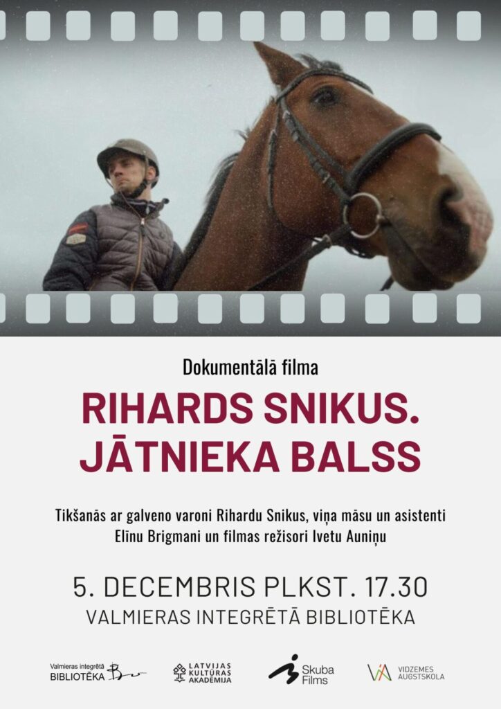 5.decembrī plkst. 17.30 Valmieras Integrētajā bibliotēkā visi laipni aicināti bez maksas noskatīties Ivetas Auniņas dokumentālo filmu “Rihards Snikus. Jātnieka balss”. Būs iespēja tikties ar filmas režisori un scenārija autori Ivetu Auniņu, filmas galveno varoni, izcilo paralimpieti Rihardu Snikus un viņa māsu, asistenti Elīnu Brigmani.