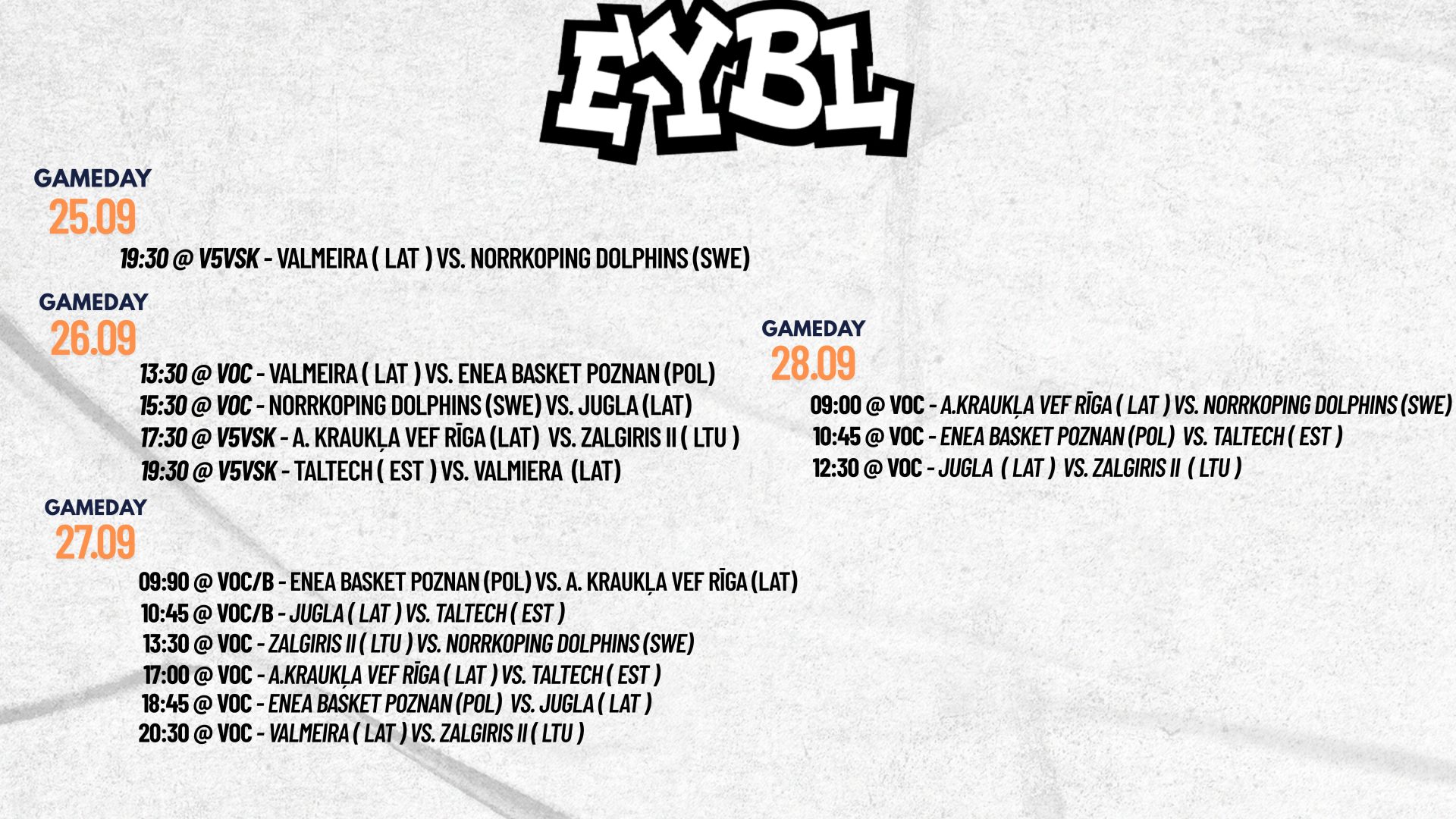 - 09:00 Valmieras OC B laukums – Enea Basket Poznan (POL) vs. A. Kraukļa VEF Rīga (LAT)