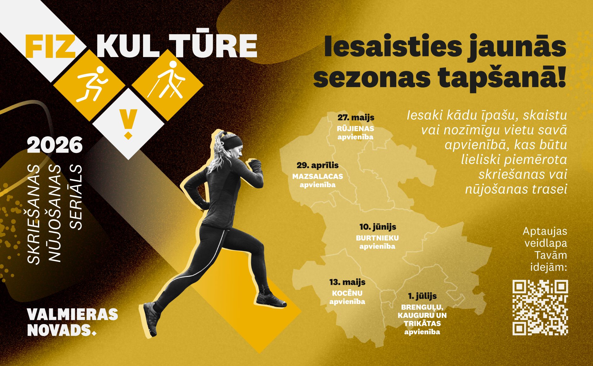 Valmieras novada skriešanas un nūjošanas seriāls “Fiz-Kul-Tūre” jau drīzumā atgriezīsies ar jaunu pavasara/vasaras sezonu. Datumi ir zināmi, un esam sākuši plānot vietas Valmieras novada apvienībās, kur šogad varētu norisināties “Fiz-Kul-Tūre” posmi.