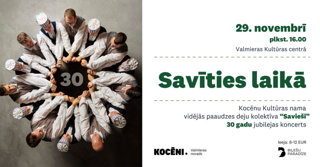 29.novembrī plkst. 16.00 Valmieras Kultūras centrā uz 30 gadu jubilejas koncertu „Savīties laikā” aicina Kocēnu Kultūras nama vidējās paaudzes deju kolektīvs „Savieši.”